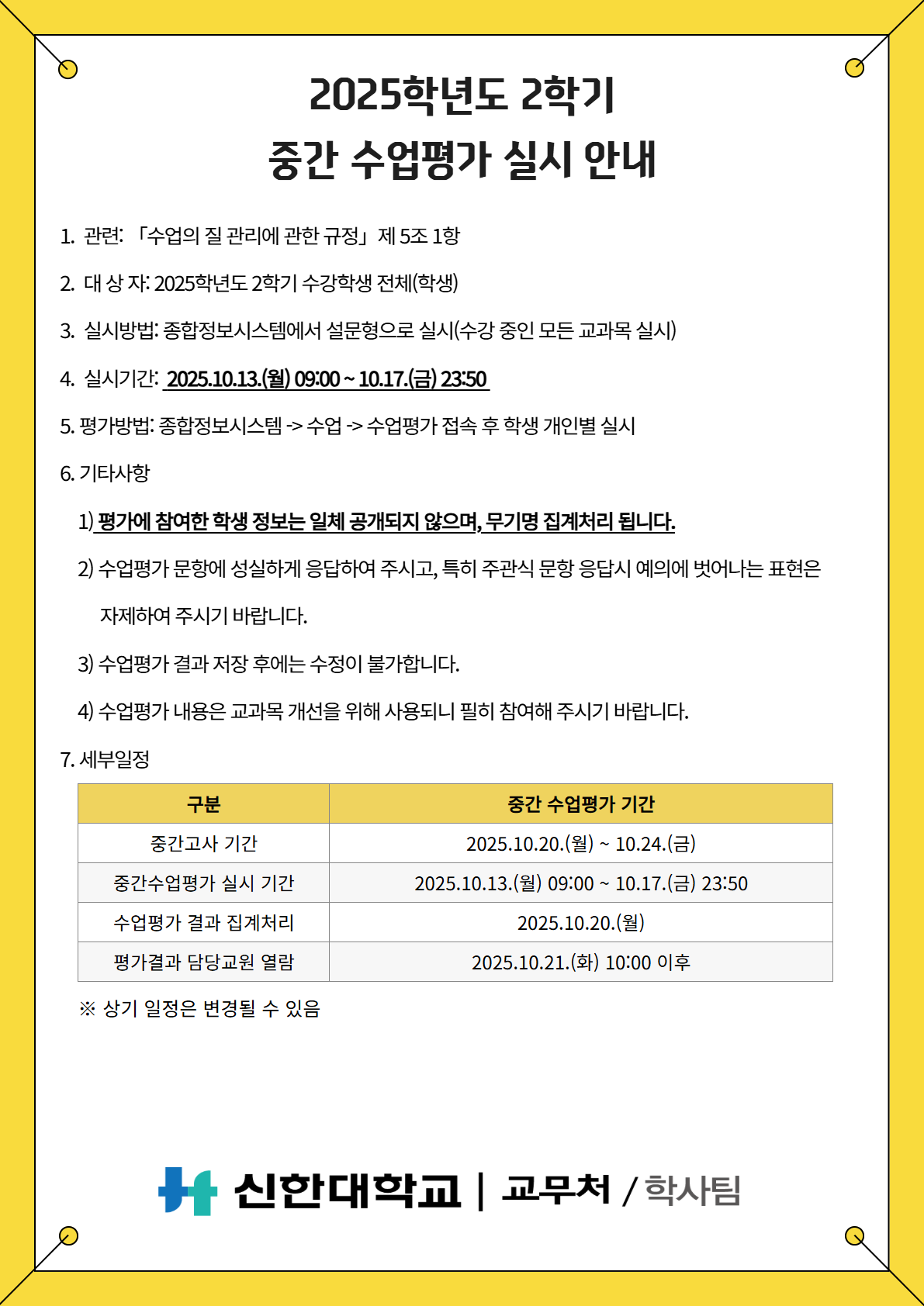 [수업] 2025학년도 2학기 중간 수업평가 실시 안내