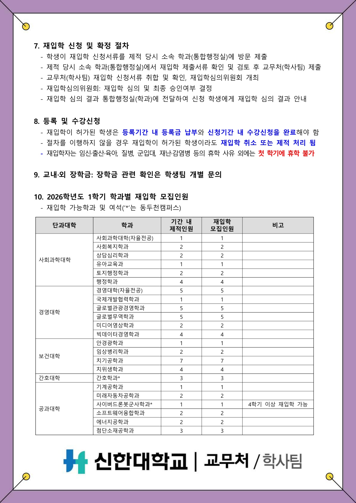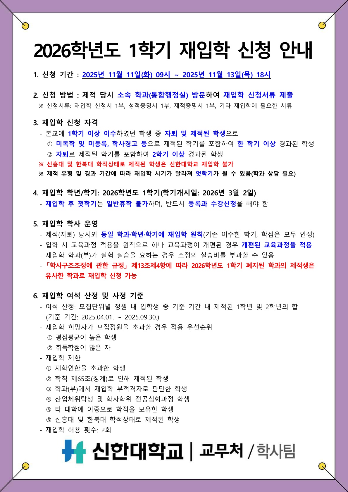 [학적] 2026학년도 1학기 재입학 신청 안내