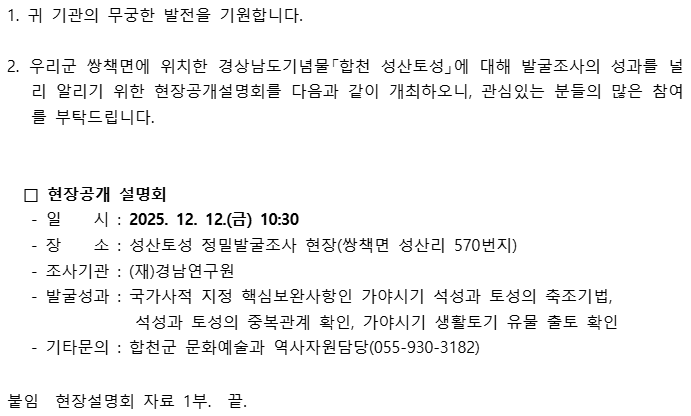 합천 성산토성 570번지 일원 정밀발굴조사 현장공개설명회 개최 알림