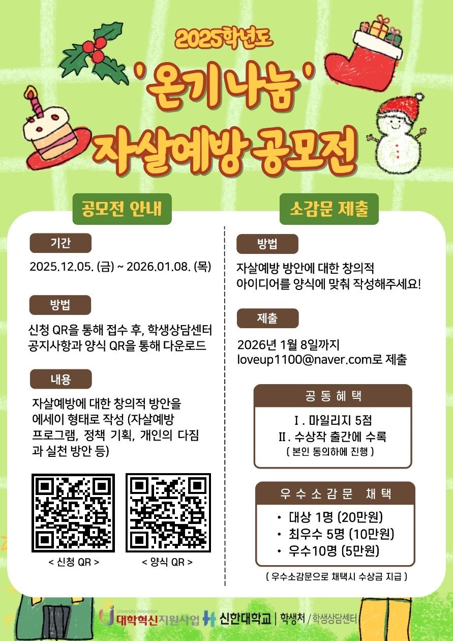 2025학년도 학생상담센터 『온기 나눔-자살예방 공모전』을 개최합니다.
