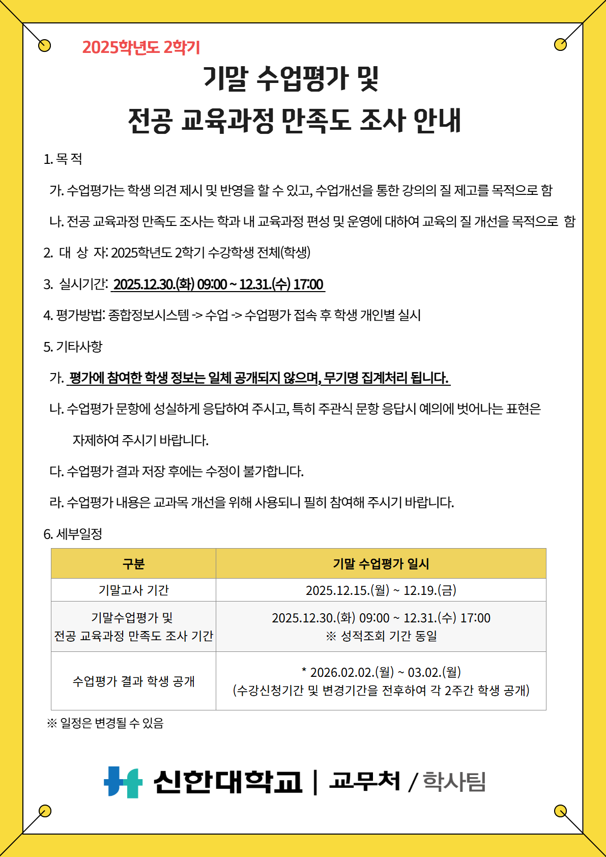 [학사팀/수업] 2025학년도 2학기 기말 수업종합평가 실시 안내