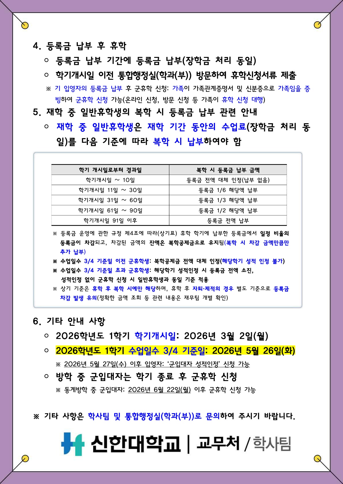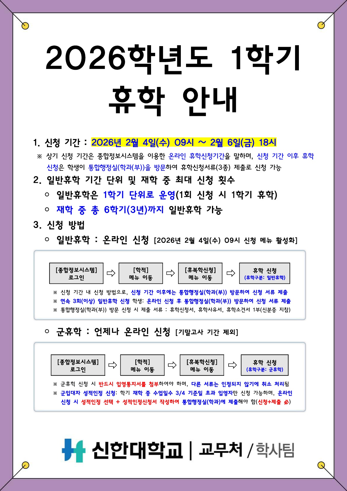 [학사팀/학적] 2026학년도 1학기 휴학 안내
