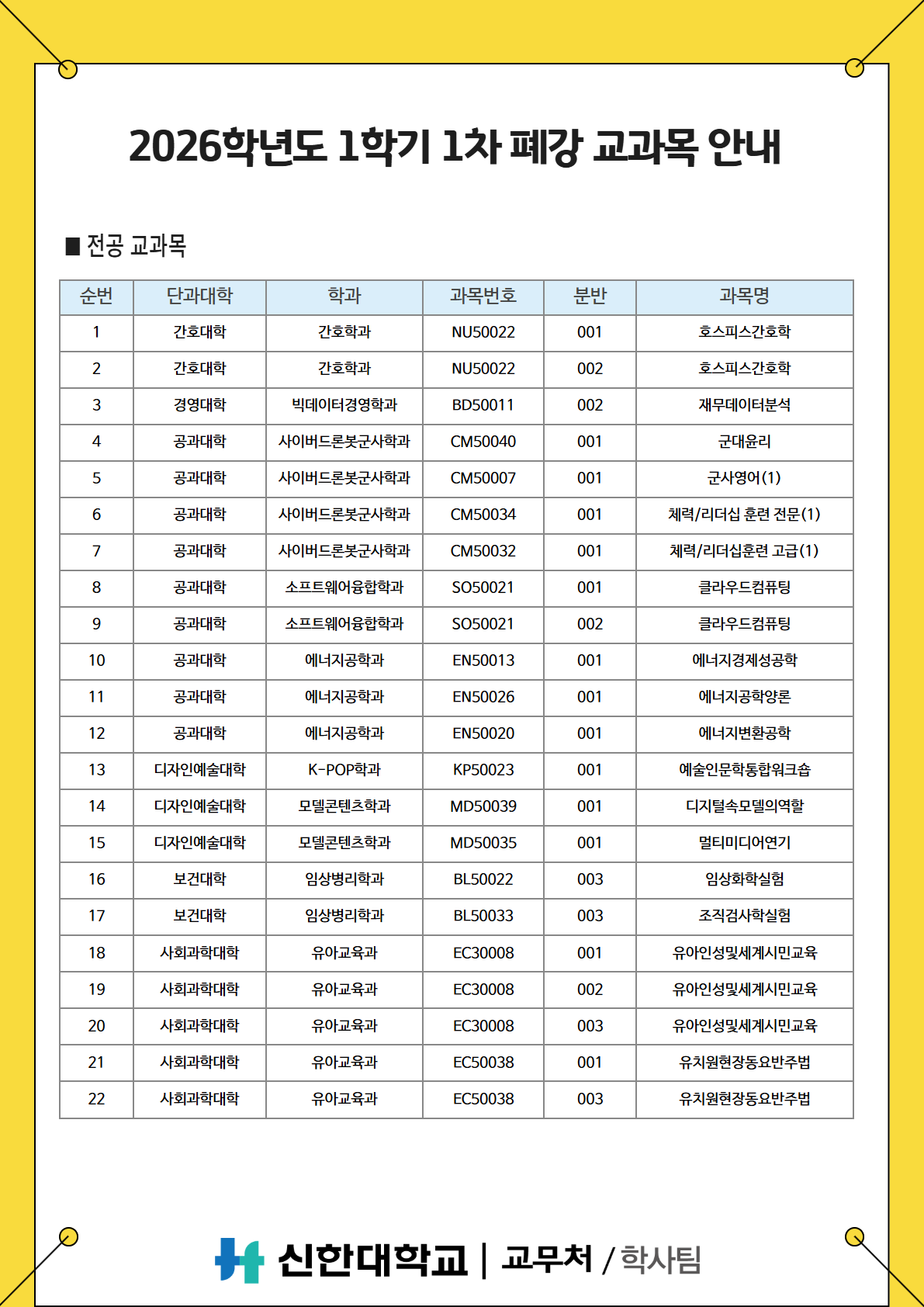 [학사팀/수업] 2026학년도 1학기 1차 폐강 교과목 안내